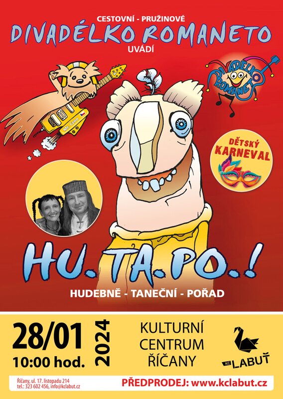 HU-TA-PO, čili HUdebně TAneční POřad pro děti a rodiče, babičky i dědy. Přijďte v maskách, nebo bez a užijeme si spolu spousty legrace.
